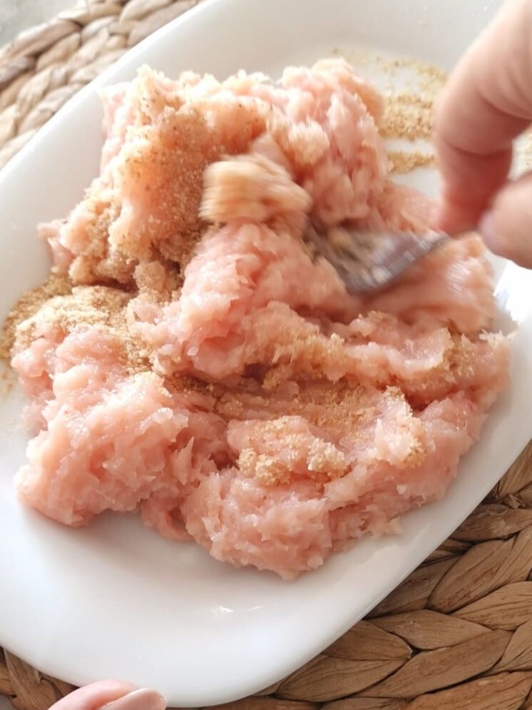 En este punto, coged una pequeña porción de carne picada y formad vuestras croquetas de pollo.
