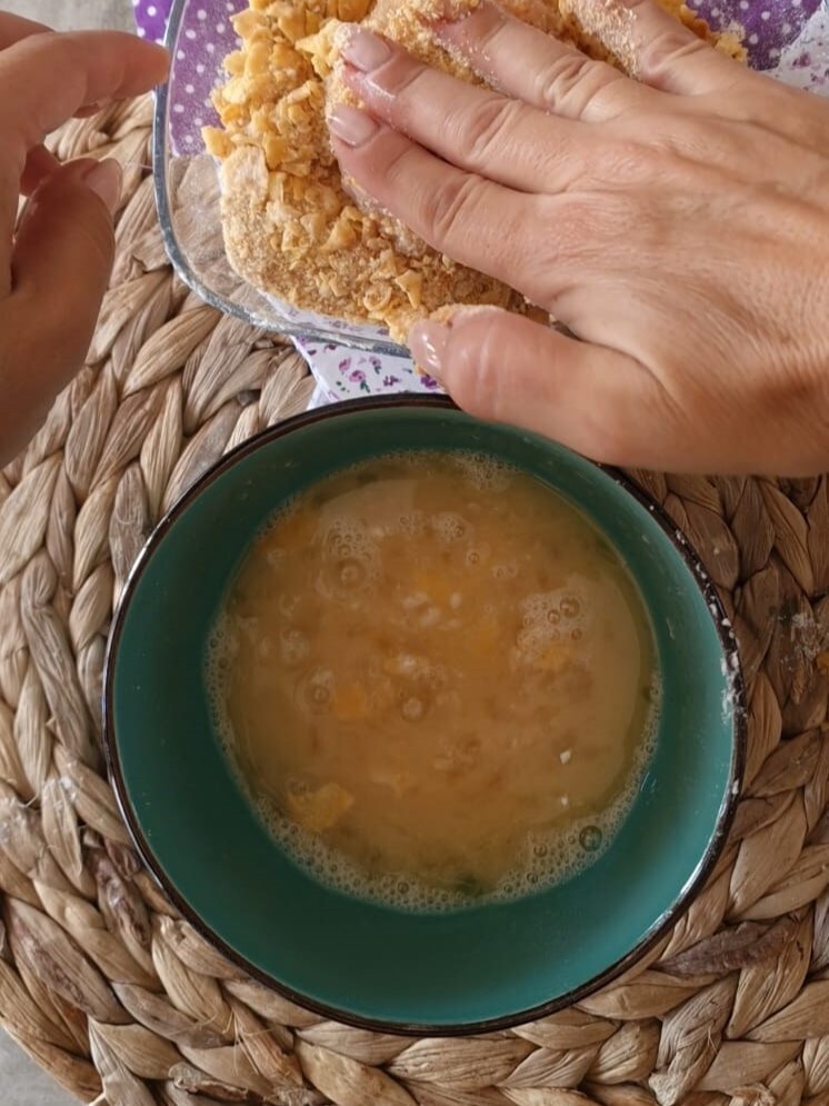 A continuación, pasad todas las croquetas primero por el huevo y luego por los corn flakes mezclados con pan rallado.