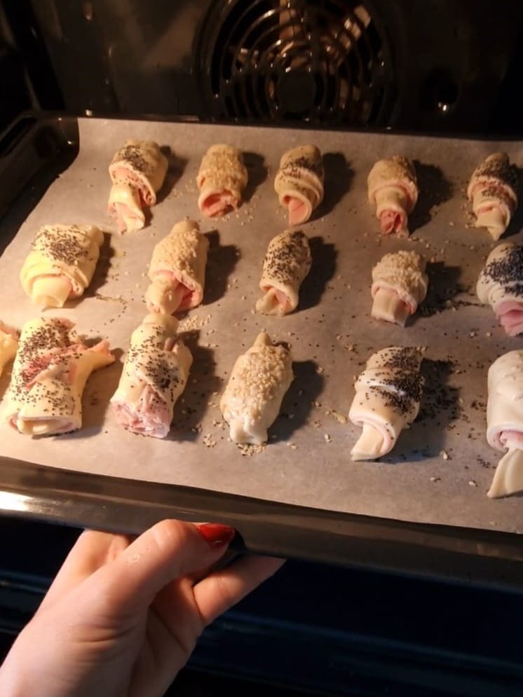Transfiere todos los cruasánes salados a una bandeja cubierta con papel de horno