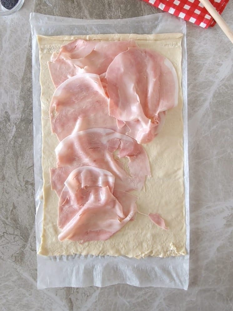 Extiende la masa leudada ya lista sobre la mesa de trabajo, luego rellena con el jamón cocido.
