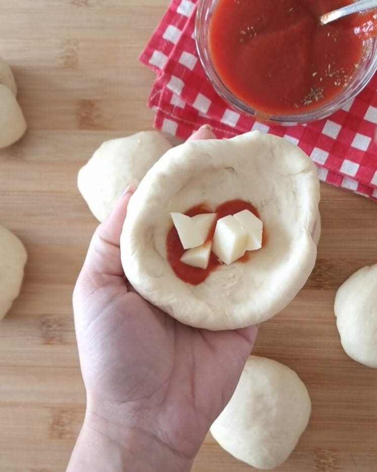 Una vez pasado el tiempo de reposo, divide la masa en 10-11 bolitas de aproximadamente 90 g cada una. Luego, al abrirlas, debes insertar una cucharadita de puré de tomate y la scamorza cortada en cubitos.