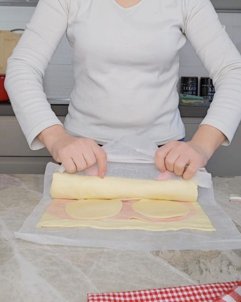 Desenrolla la masa de hojaldre, luego rellena con jamón cocido y queso.