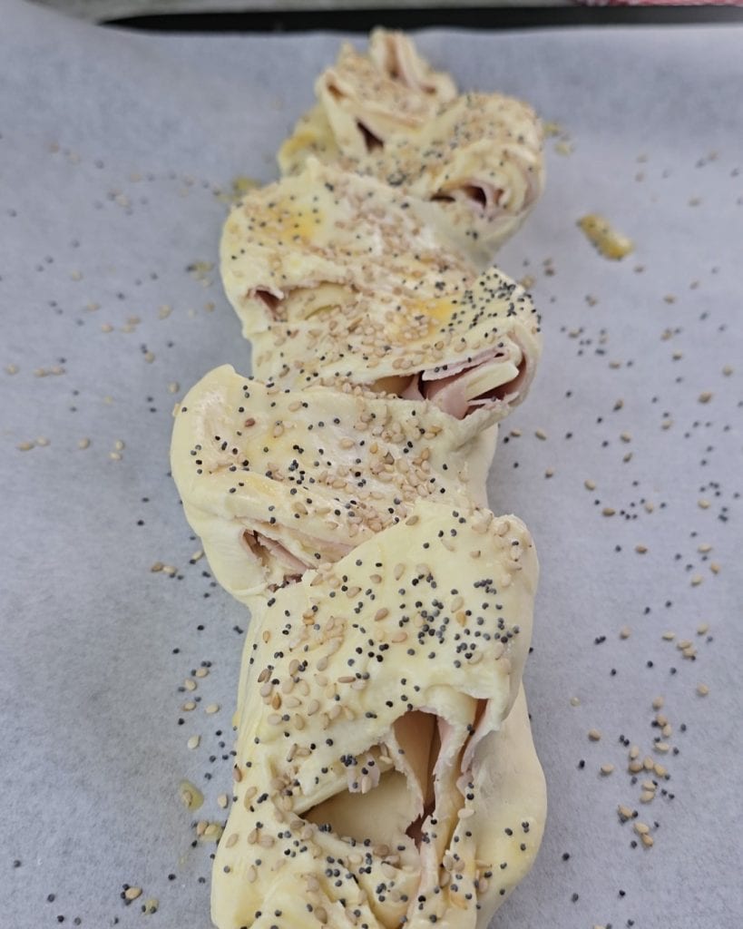 Pincela con huevo batido y un chorrito de leche y decora con semillas de sésamo y amapola.