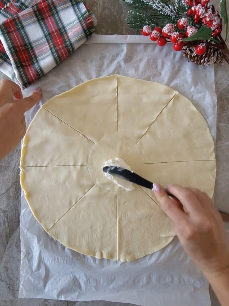 Desenrolla la pasta de hojaldre, coloca una taza en el centro y haz cortes, divídela en 8 partes, luego rellénala con la Philadelphia y el salmón.