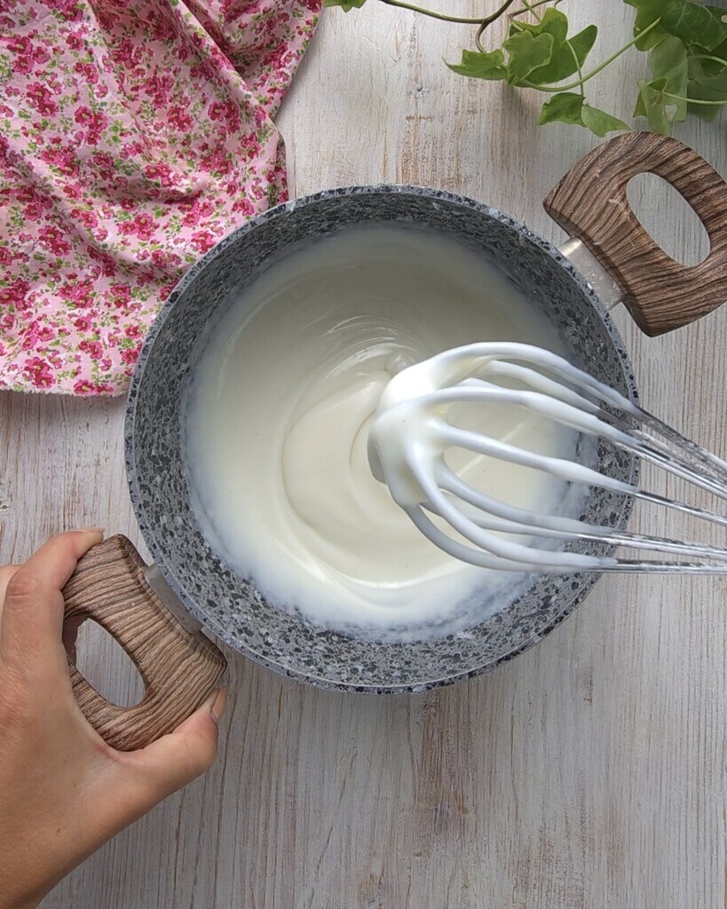 Incorpore también la fécula de maíz y mezcle, luego póngalo al fuego, revolviendo de vez en cuando hasta que espese, tomará aproximadamente 5 minutos.
