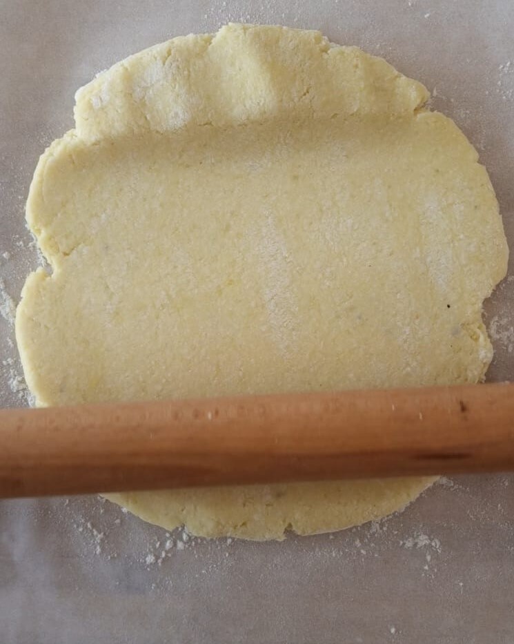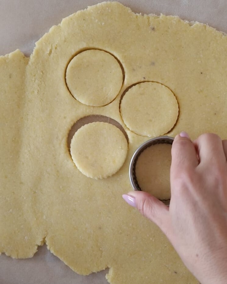 Extended la masa sobre una hoja de papel para horno y con un cortador de pasta preparad muchos discos.