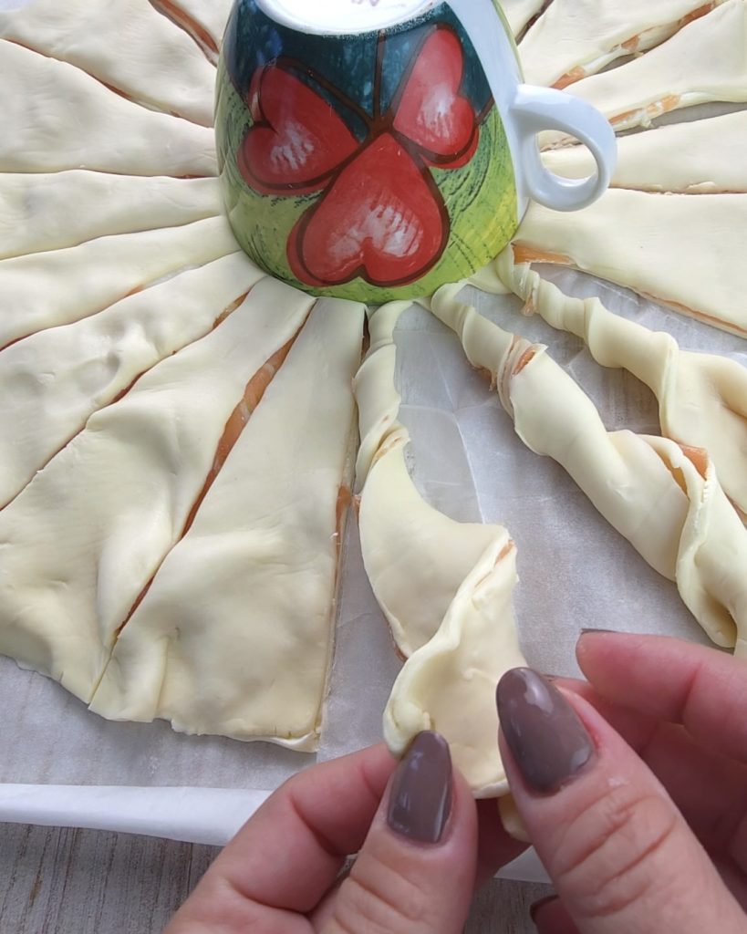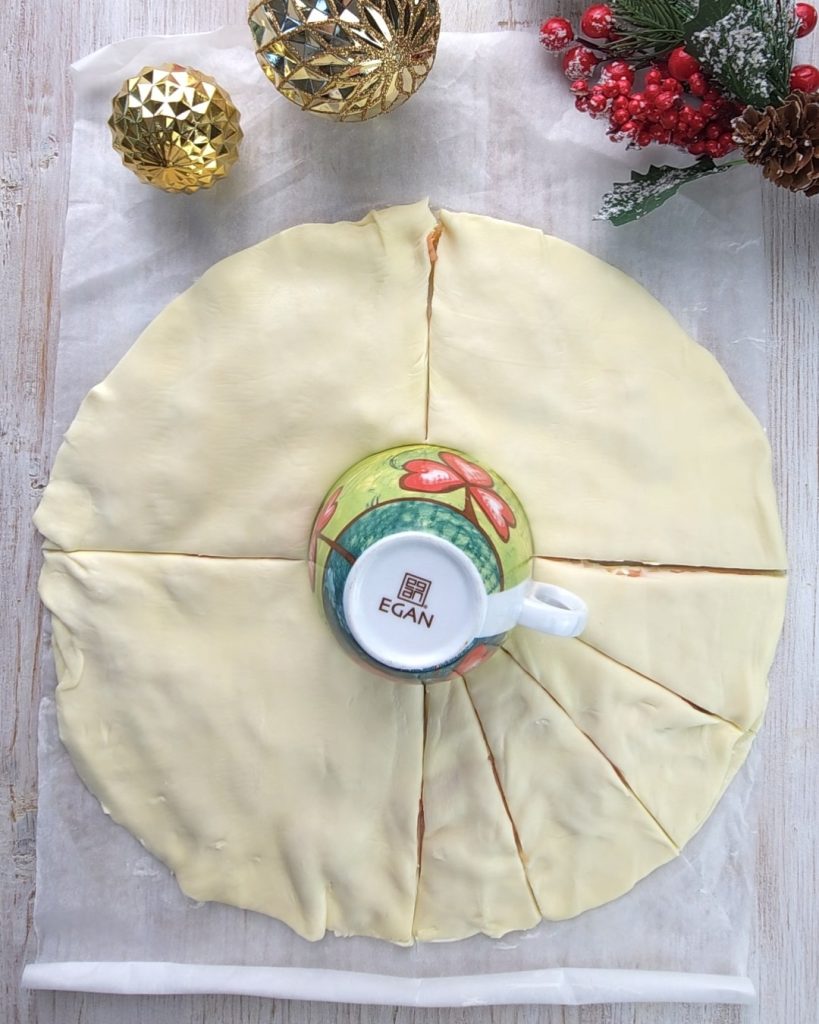 Superpón el otro disco encima del primero y coloca una taza en el centro presionando ligeramente. Con un cuchillo bien afilado de hoja lisa, divide el hojaldre en cuatro partes iguales, luego divide nuevamente cada parte en cuatro o máximo seis segmentos adicionales (en mi caso salieron 19 secciones).