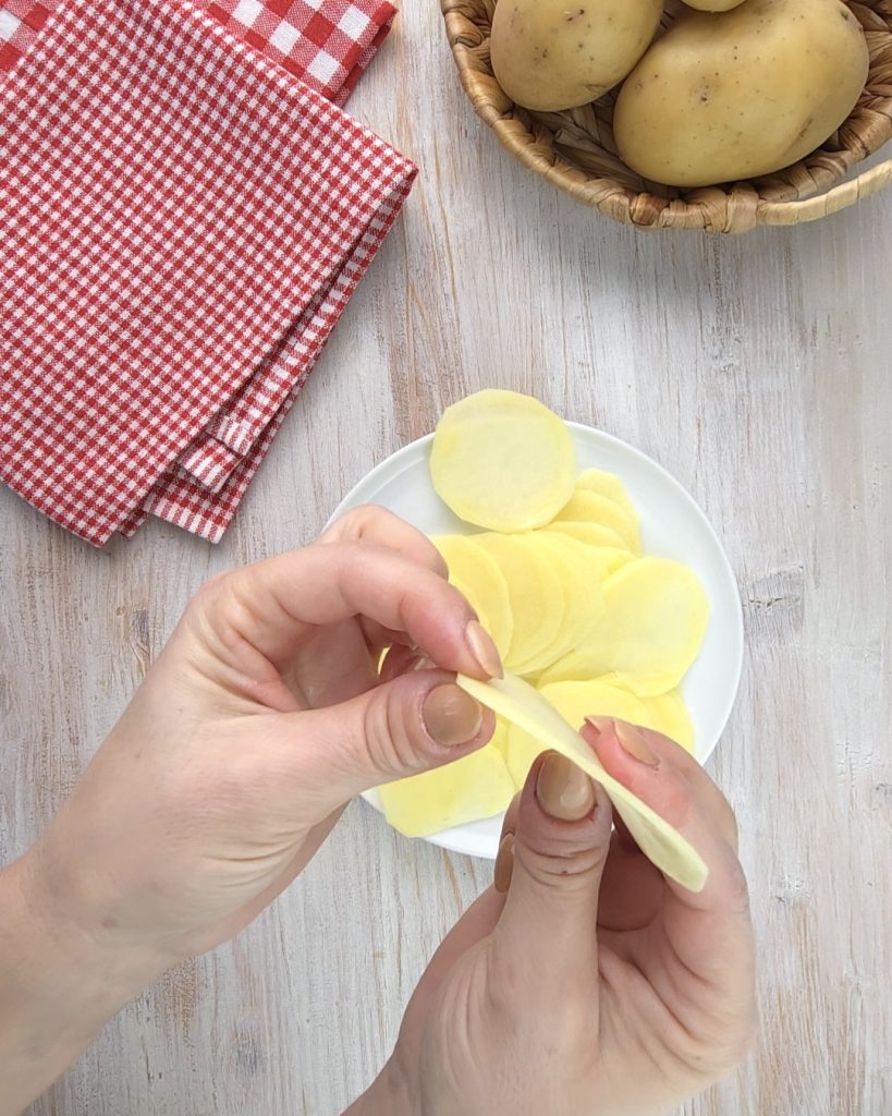Lava y pela las patatas, córtalas en rodajas con la mandolina o con el cortafiambres de unas 5 mm de grosor.En este punto, forra una bandeja de horno con papel de hornear, úntala con aceite y espolvorea con pan rallado, luego distribuye el queso rallado y coloca las patatas una al lado de la otra. Sazona con sal y orégano.