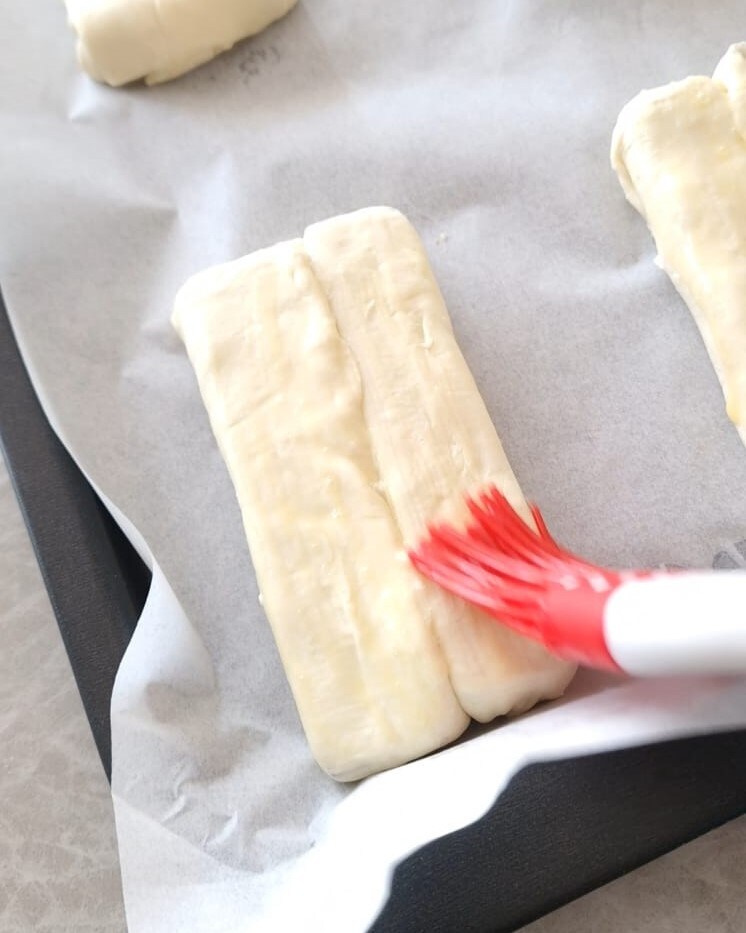 En este punto divide el hojaldre en cuatro rectángulos, cada uno con dos barritas dentro.