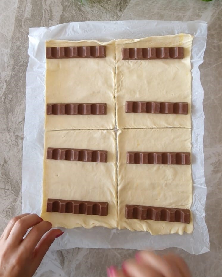 Toma cada pieza y enrolla las barritas de chocolate en el hojaldre.