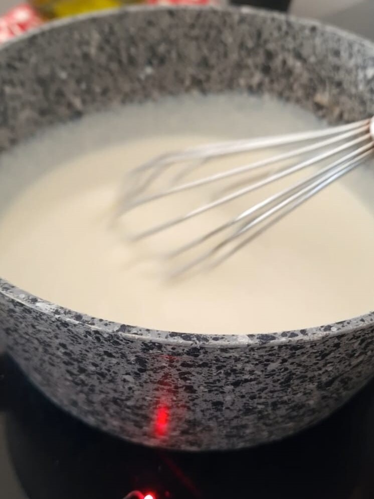 Luego vuelve a ponerlo al fuego y mezcla hasta que se dore. Ahora que tienes el roux, añade la leche caliente y condimenta con una pizca de nuez moscada y sal, luego mezcla hasta que espese, tomará aproximadamente 10 minutos.
