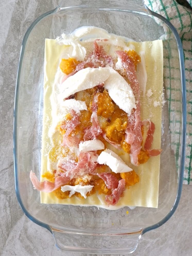 Disponed en el fondo de una fuente para horno un poco de bechamel, luego colocad la pasta, añadid la calabaza y el speck cortado en tiras y a continuación la mozzarella y el queso parmesano rallado.