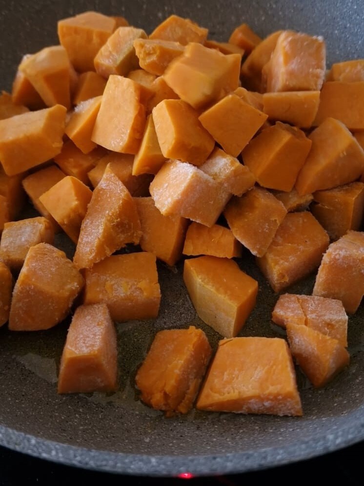 Cortad la calabaza en trocitos, después salteadla en la sartén con el ajo y un chorro de aceite de oliva. Salpimentad y continuad la cocción durante otros 10 minutos, si fuera necesario añadid caldo vegetal o agua caliente.