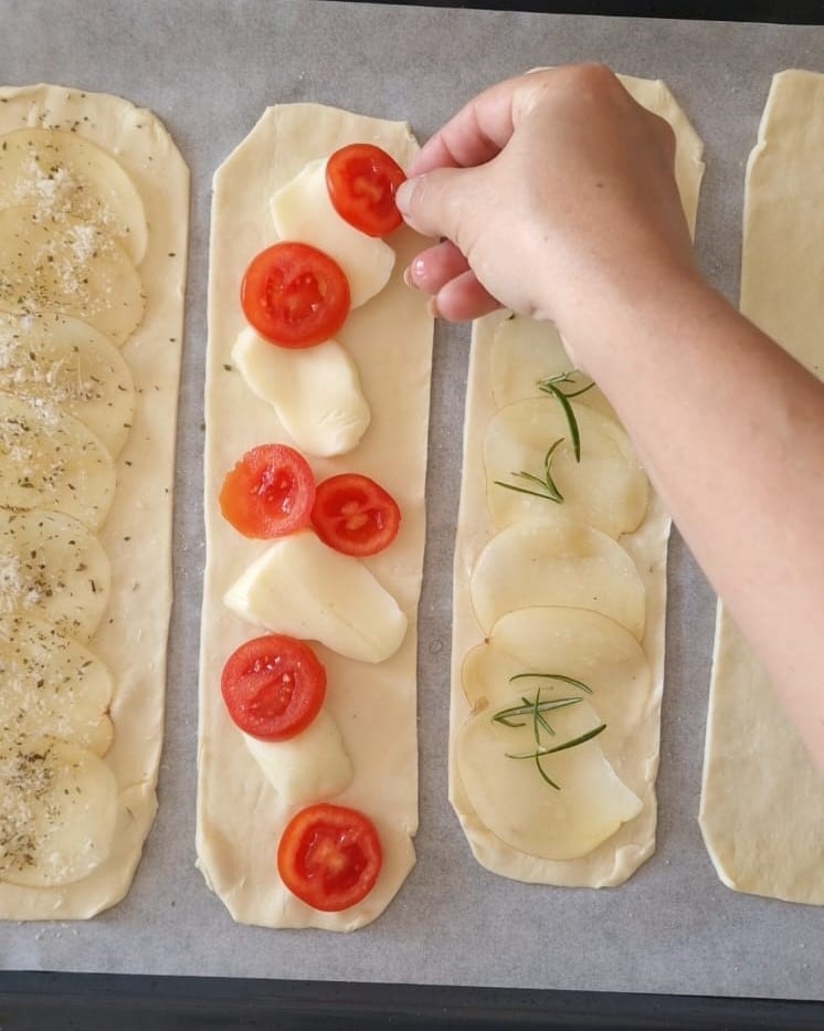 En este punto, rellenad una como más os guste, yo hice una con patatas cortadas finas, sazonadas con sal, orégano y parmesano.