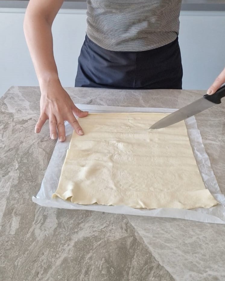 Comenzad desenrollando la masa de hojaldre, luego dividid cada hojaldre en 4 rectángulos