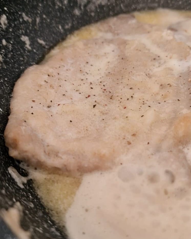 Transfiere la carne a un plato y mantenla caliente. A continuación, vierte la leche en la misma sartén, sala, añade pimienta y deja que espese durante unos 4 minutos.