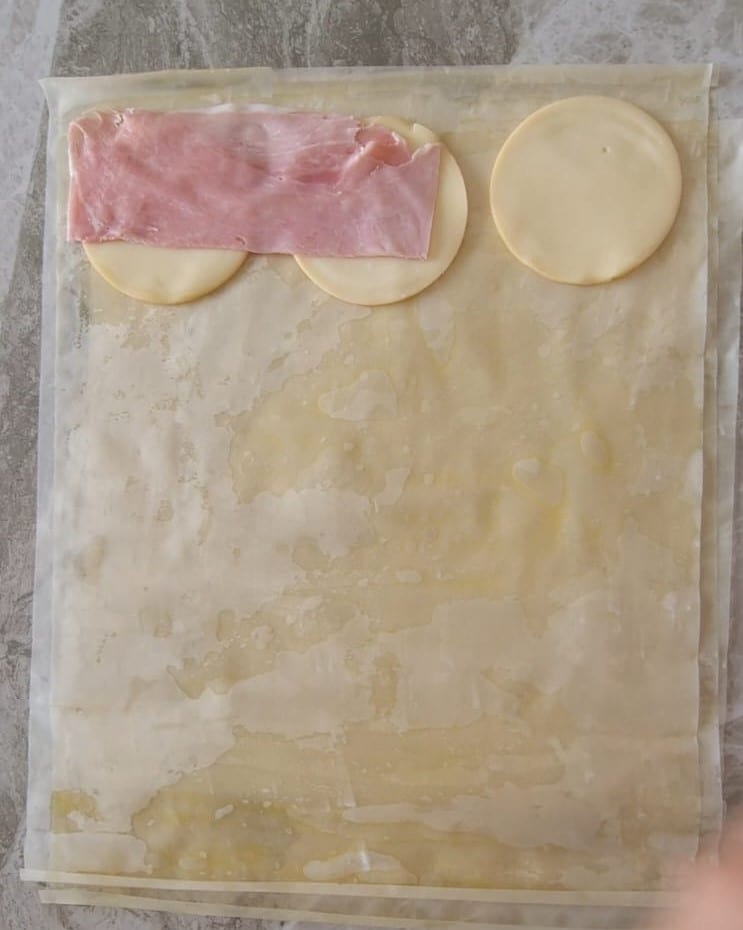 Coloca una primera hoja de pasta filo sobre la superficie de trabajo, úntala con aceite y cubre con una segunda y tercera hoja de pasta filo.