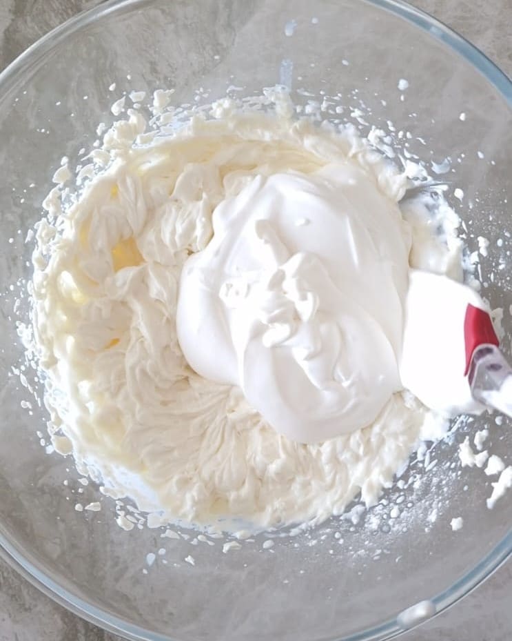 Prepara la crema: En un bol mezcla el queso crema, la ricotta, el azúcar y añade la gelatina escurrida y disuelta en dos cucharadas de nata caliente. El resto de la nata, móntala e incorpórala a la crema.