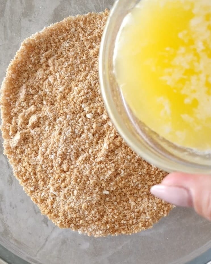 Ocúpate de la base: en un procesador coloca las galletas secas y tritúralas finamente, luego pásalas a un bol. Añade la mantequilla derretida y mezcla con una cuchara hasta obtener una mezcla húmeda.