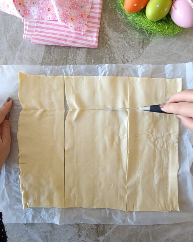 Desenrollad la primera hoja de masa de hojaldre y divididla en 6 rectángulos iguales de aproximadamente 11x12cm.