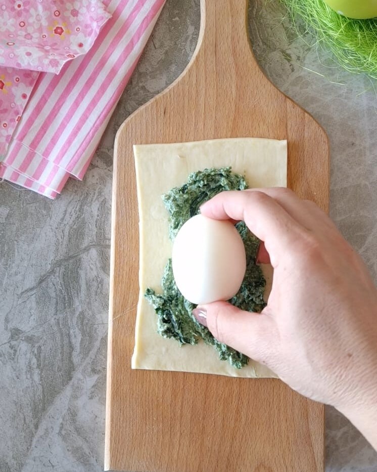 Añadid otra cucharada de la mezcla de espinacas sobre el huevo duro.