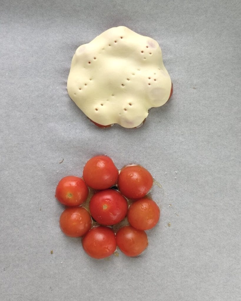 • Desenrolla la masa de hojaldre y con un cortapastas corta círculos, luego colócalos encima de los tomates cherry.