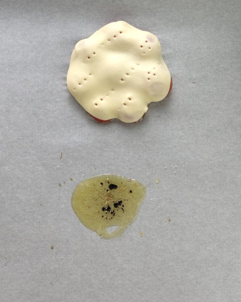 • Coloca el papel de horno en una bandeja, realiza círculos con aceite y una gota de vinagre, una pizca de sal y orégano.