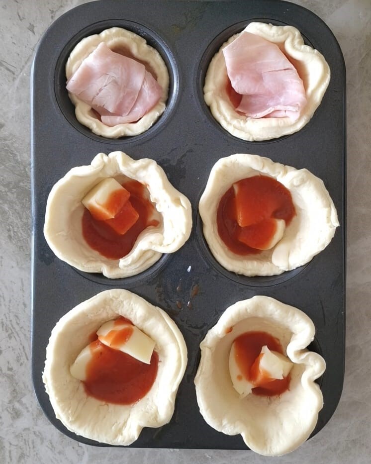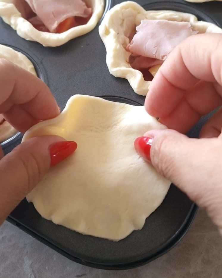 Colócalos en un molde para muffin previamente engrasado, y luego rellénalos con scamorza, jamón cocido y puré de tomate.