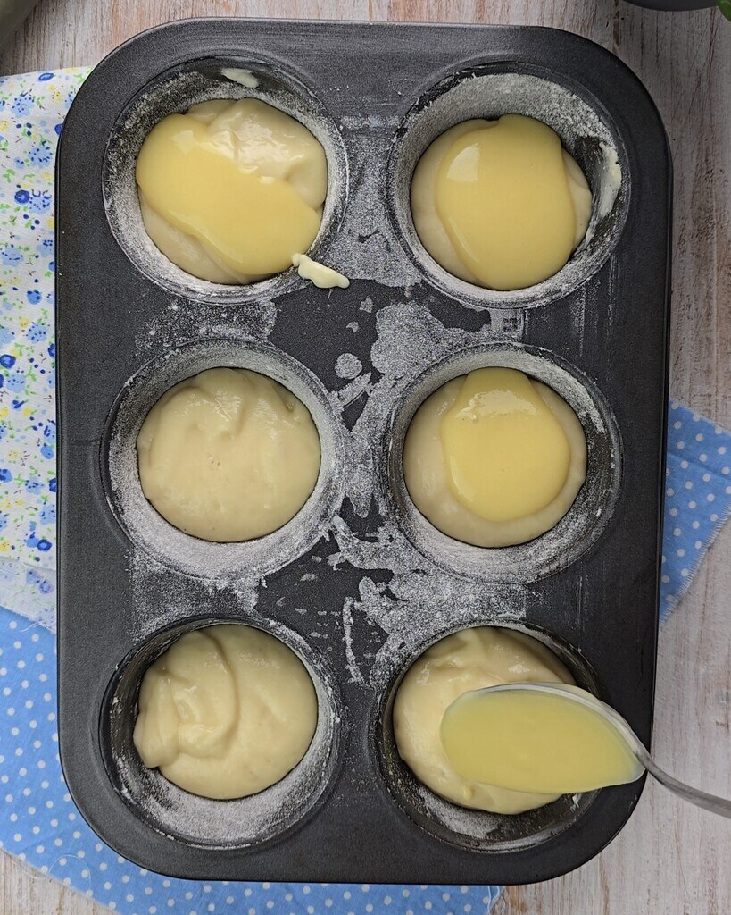 Entonces, vierte la mitad de la mezcla en los moldes para muffins, previamente engrasados y enharinados, añade encima una cucharada generosa de crema pastelera.