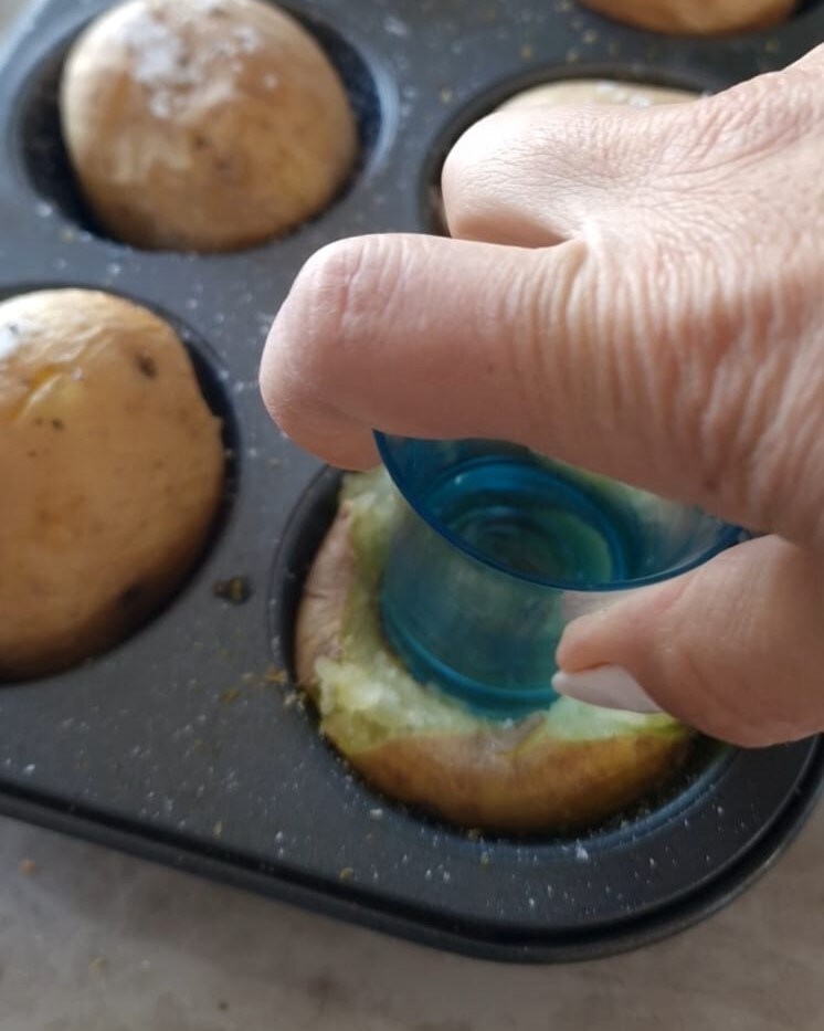Comience lavando muy bien las patatas, luego colóquelas dentro del molde para muffin ligeramente aceitado.