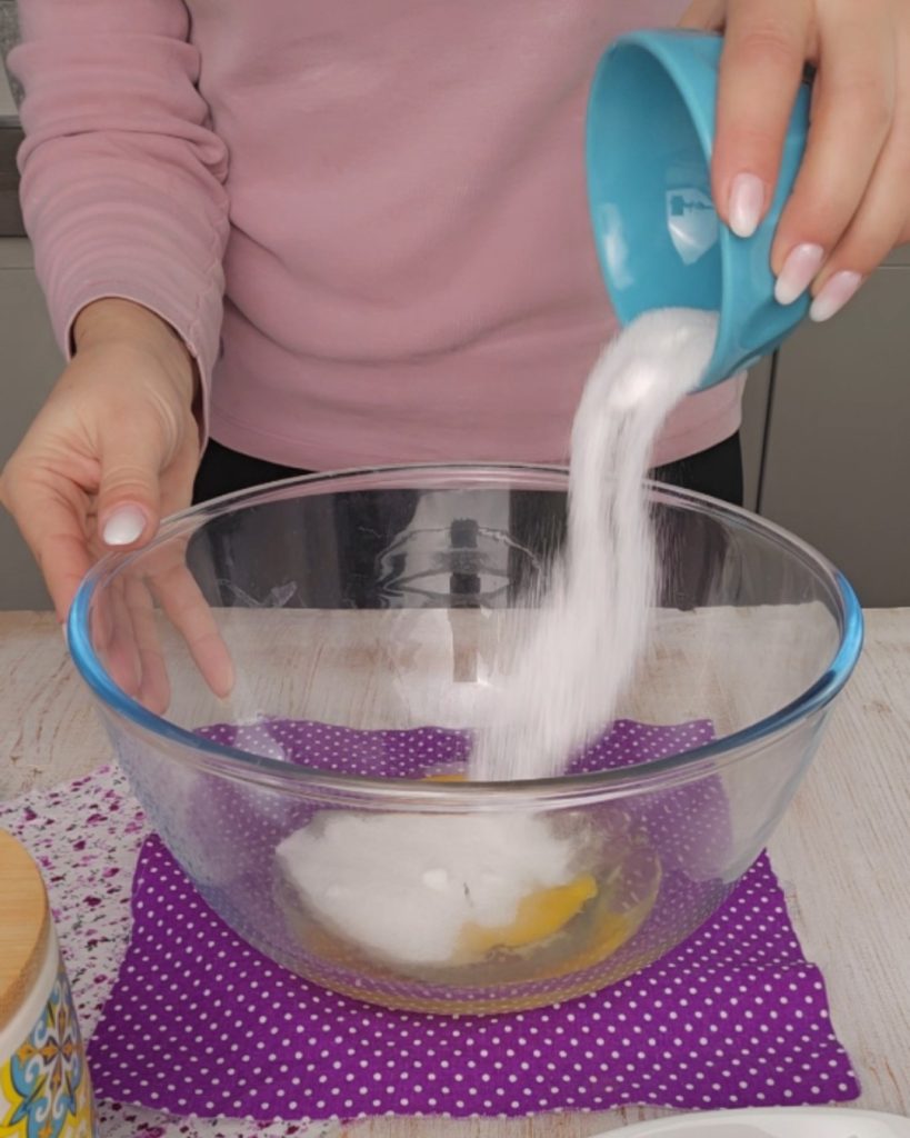 • En un bol grande, mezcla los huevos con el azúcar, batiendo con unas varillas.