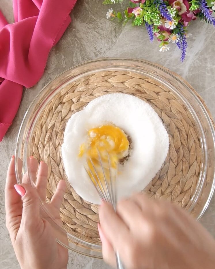 Con un batidor, en un bol grande bate el huevo con el azúcar.