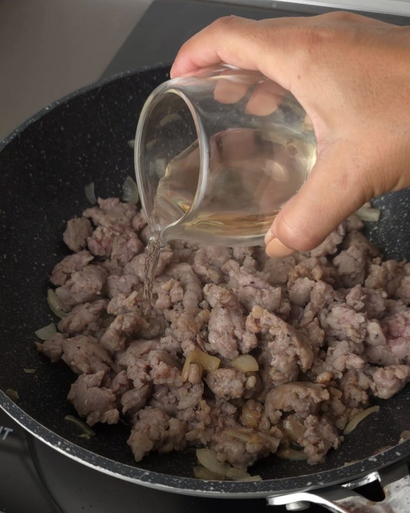 Mientras tanto, toma la salchicha fresca, quítale la tripa, y luego desmenúzala dentro de la sartén junto con el sofrito.