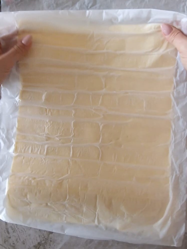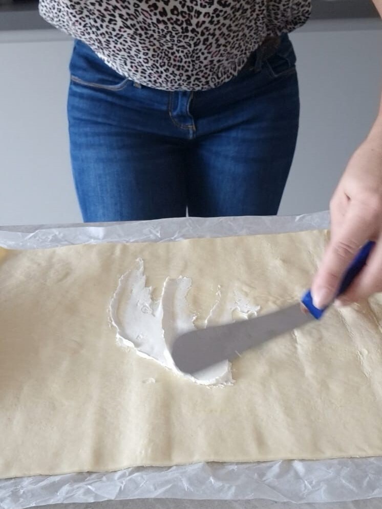 Estira el primer rollo de masa de hojaldre, luego unta el queso.