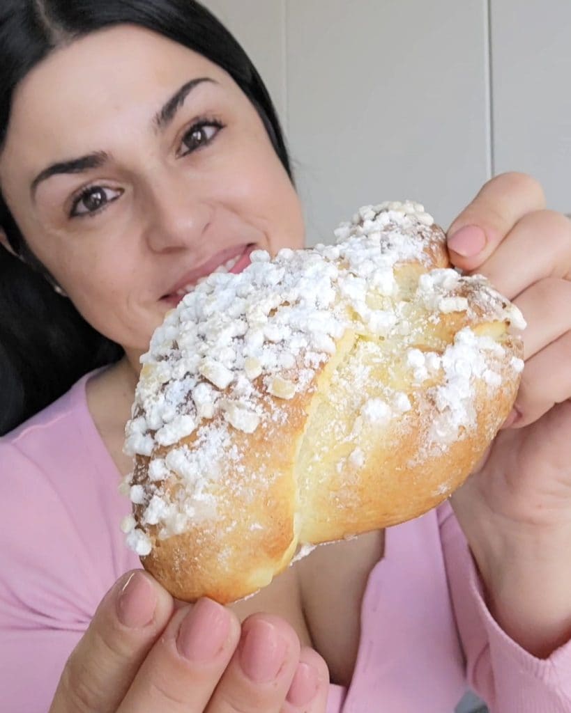 Palomas dulces son unos pastelitos muy suaves de la tradición pascual, preparados sin molde. Se hacen con masa fermentada a base de harina, huevos, mantequilla y aromas como cáscara de limón y vainilla. Se glasean y se decoran con gránulos de azúcar, si lo prefieres, puedes agregar almendras también. Si buscas la versión más grande, te recomiendo la paloma de chocolate o versiones originales como la paloma Danubio con nutella, suave como una nube. Las palomas son símbolo de paz y renacimiento, a menudo se regalan en las festividades de Pascua. Si te ha gustado la receta, ¡corre a prepararla y no olvides seguirme en mis páginas sociales de Facebook e Instagram