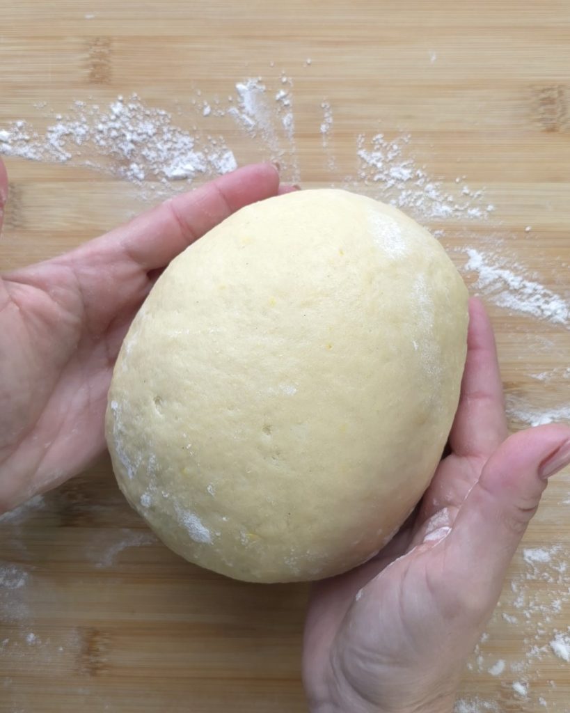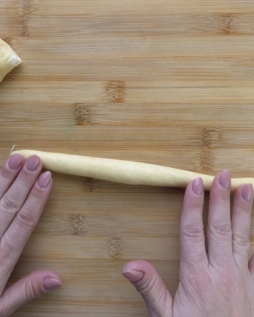Después del tiempo de reposo, dividir en bolitas de unos 100 g cada una y formar unos cilindros.