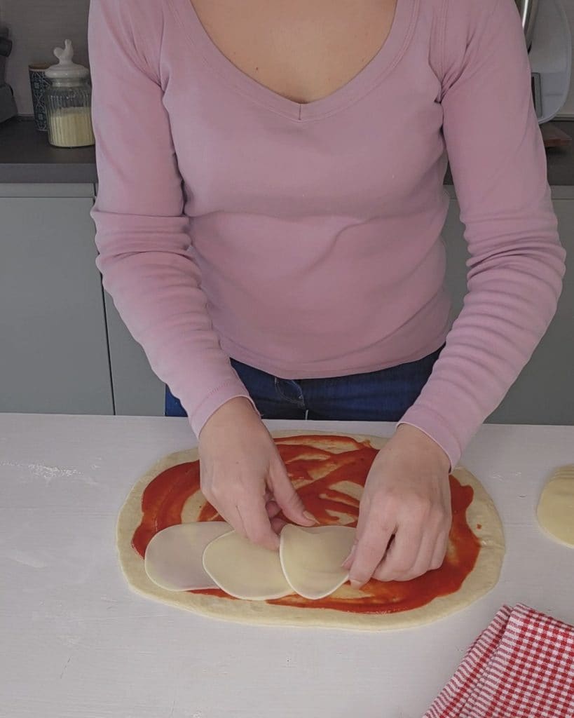 Mientras tanto, mezcla el puré de tomate con el concentrado de tomate, sal y orégano. Pasado el tiempo de reposo, extiende la masa formando un rectángulo.