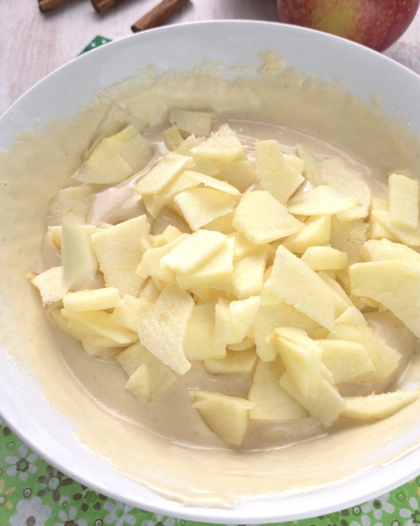 Pelad una manzana y cortadla en láminas muy finas o ralladla y añadidla a la masa.
