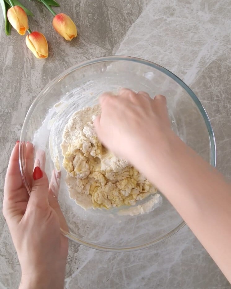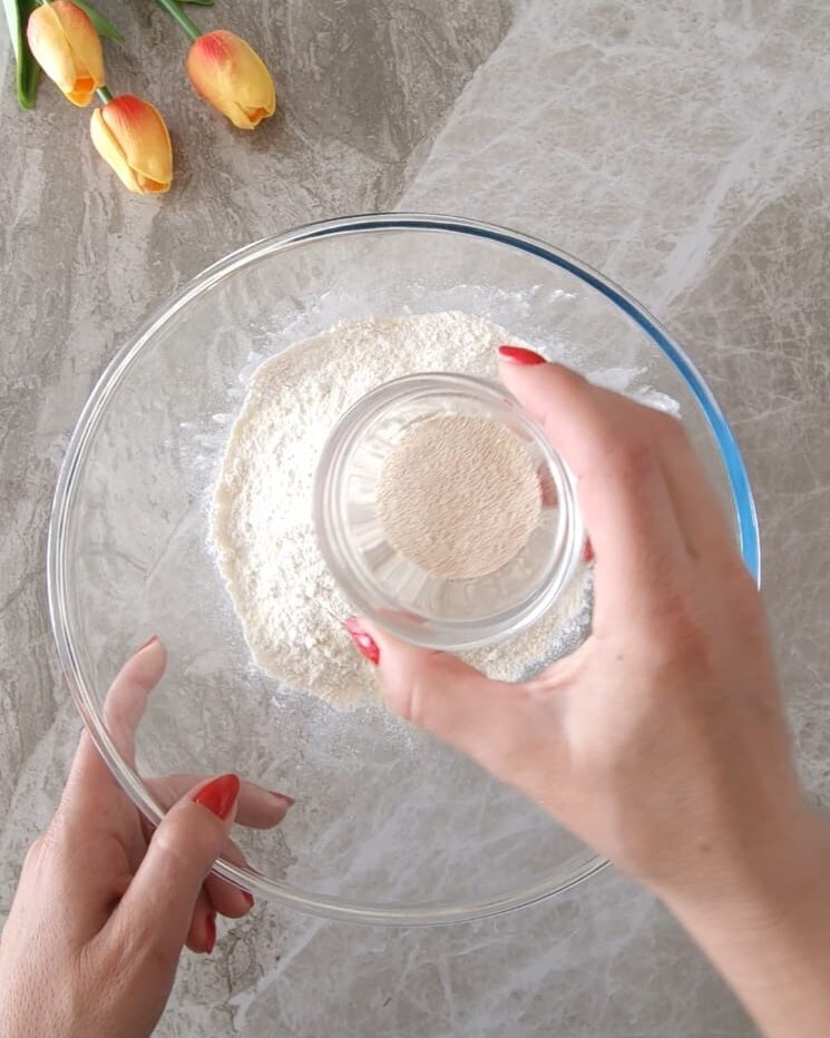 • Para preparar la masa de las focacitas se necesita un bol grande y se añaden las harinas y la levadura, luego se mezcla todo con un tenedor (o con la amasadora).