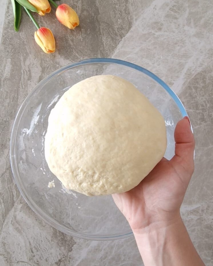 • Transfiere la masa a un bol y cúbrela con film transparente dejándola leudar por al menos 2 horas en el horno apagado con solo la luz encendida.