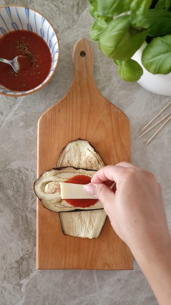 A continuación, añadid la salsa de tomate y seguid agregando un trocito de queso, como por ejemplo la scamorza u otro queso de pasta blanda.