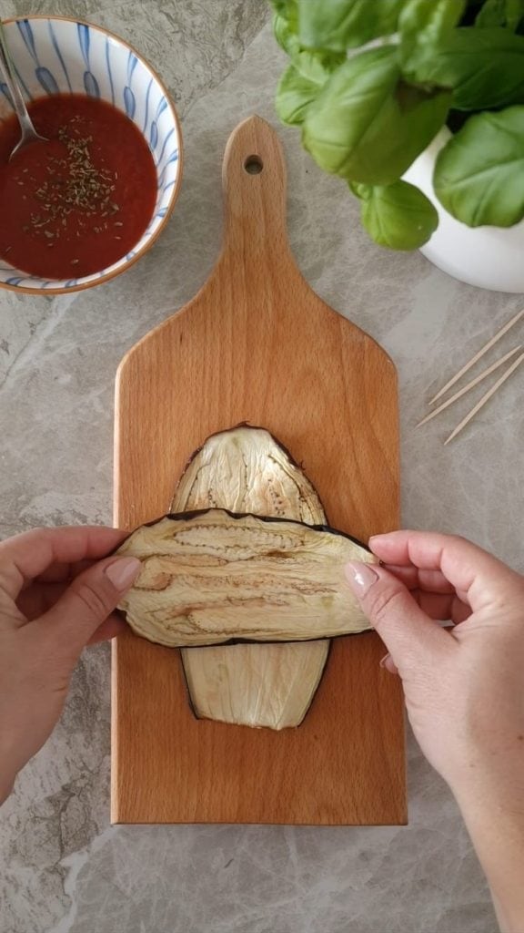 En este punto, pasad los paquetitos de berenjena primero por el huevo y luego por el pan rallado.