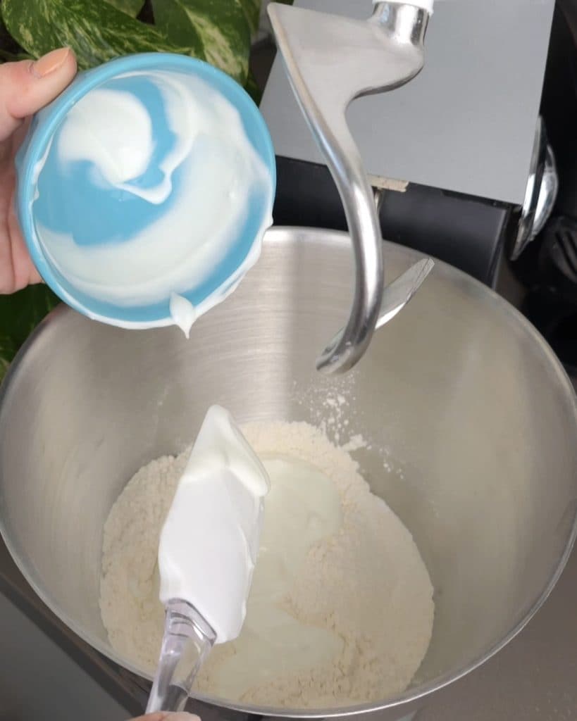 En un bol grande, echad la harina y la levadura tamizadas, haced un agujero en el centro con el tenedor, luego echad el yogur y comenzad a amasar. Como alternativa, usad la amasadora con el gancho amasador.