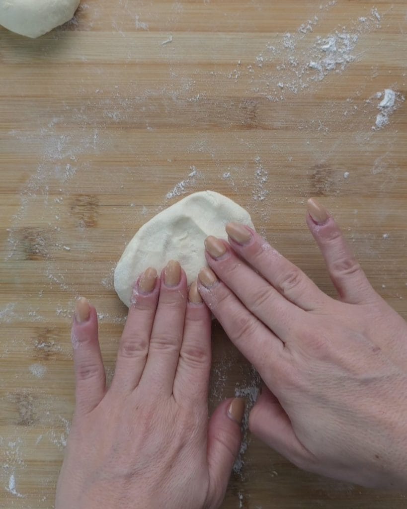 Proseguid transfiriendo la masa obtenida sobre una superficie enharinada, luego dividid en 12 bolitas, seguidamente con el rodillo o con las manos, estiradlas todas formando discos.