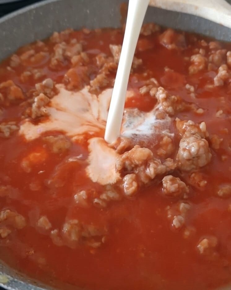 •  Vierte la salsa de tomate, la nata fresca, continuando cocinando todo hasta que espese, por alrededor de 7-8 minutos.