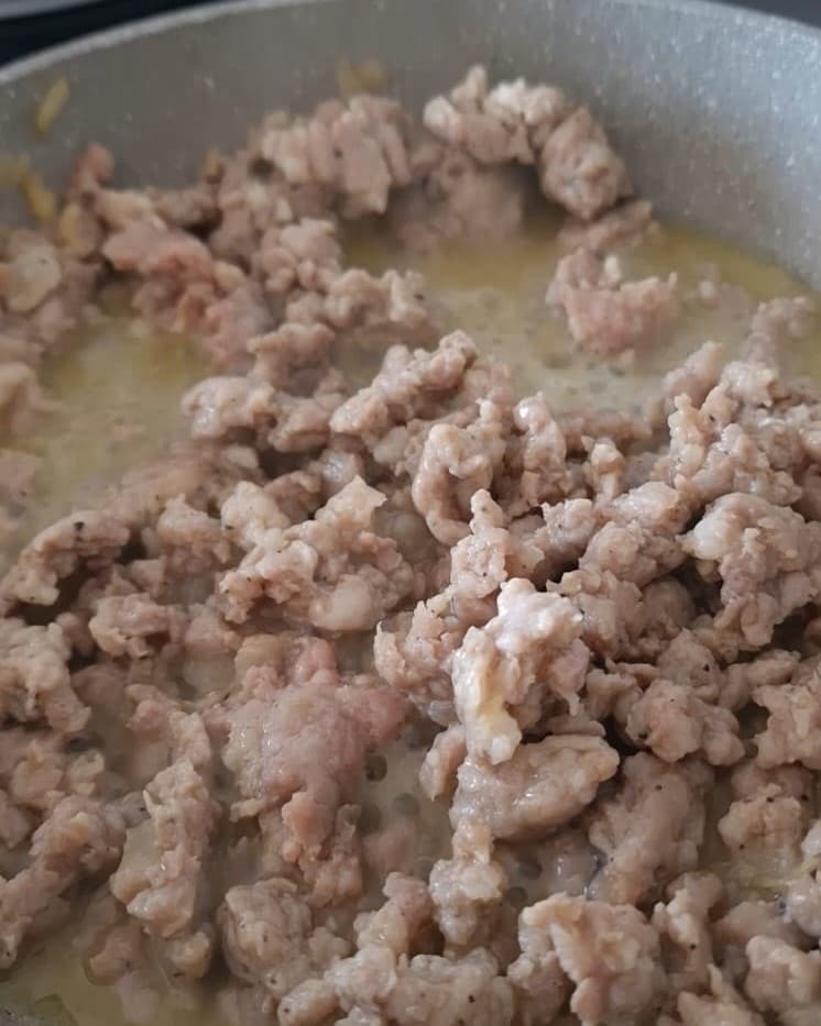 • Añade la salchicha desmenuzada dejándola dorar 2-3 minutos. Desglasa con el brandy y luego añade el chile, cocinando a fuego alto.