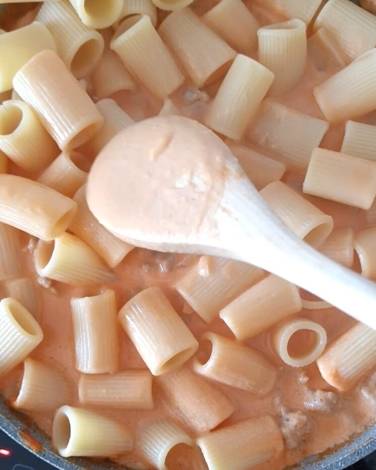 • Escurre la pasta y viértela en la sartén con el condimento, mezcla bien todo, dejando que el condimento espese un poco.