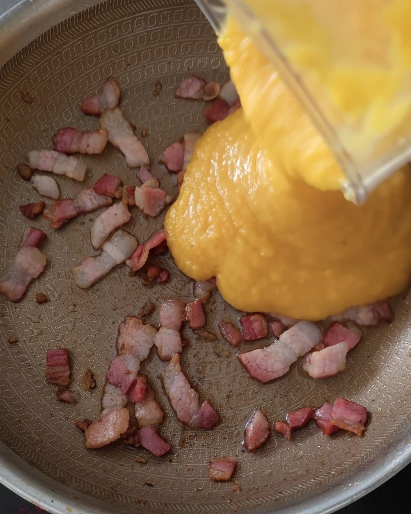 Mientras tanto, en la misma sartén donde se cocinó la calabaza, dora la panceta y luego añade la crema de calabaza.