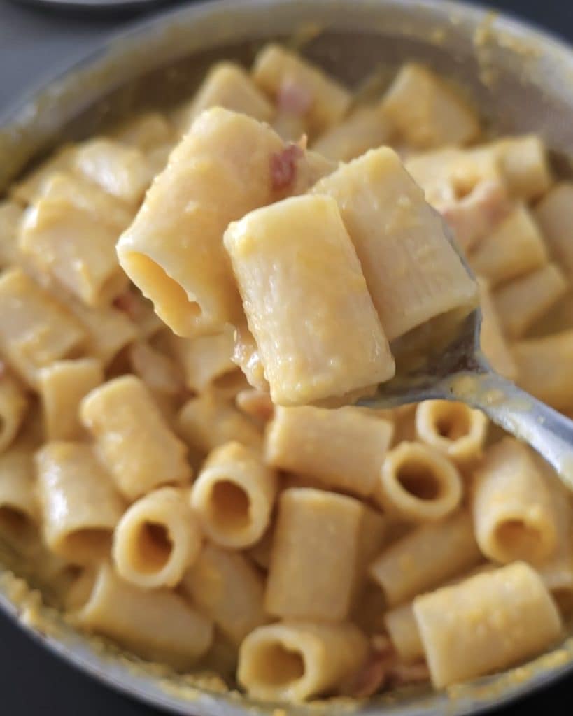 Cuece la pasta, escúrrela y viértela en la sartén junto con la crema de calabaza y panceta. Saltea durante unos minutos en el condimento.