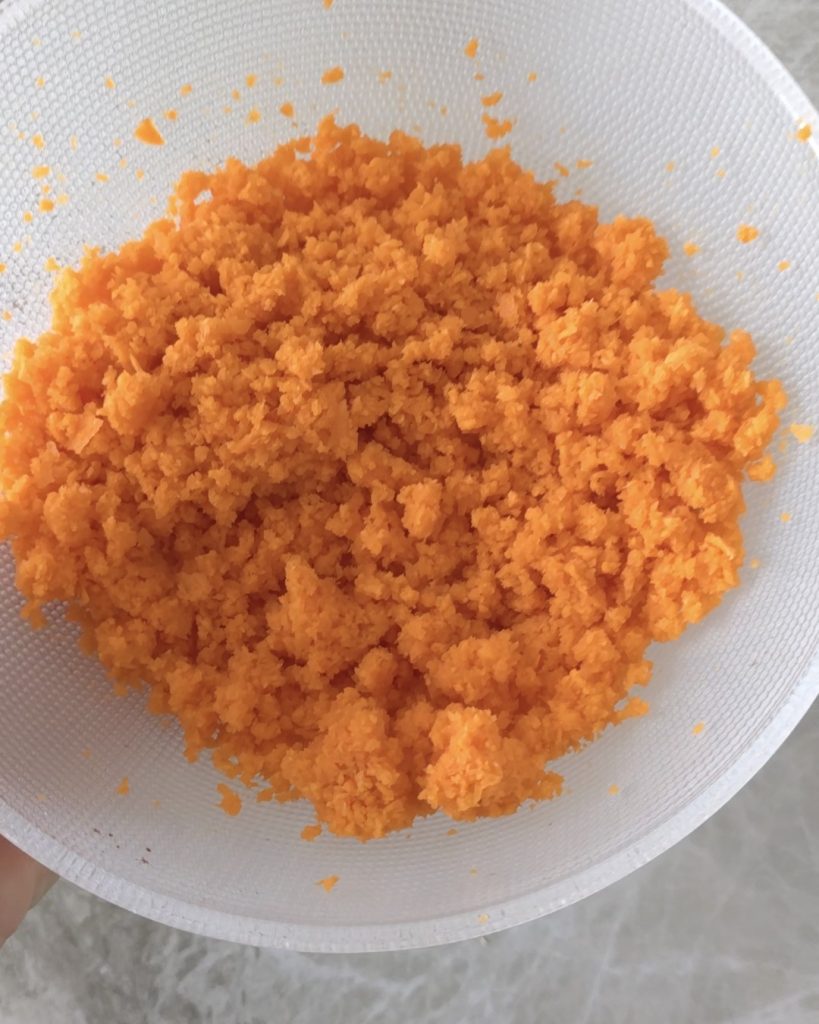 En un procesador de alimentos, tritura las zanahorias, luego escúrrelas del líquido en exceso con la ayuda de un colador y resérvalas.